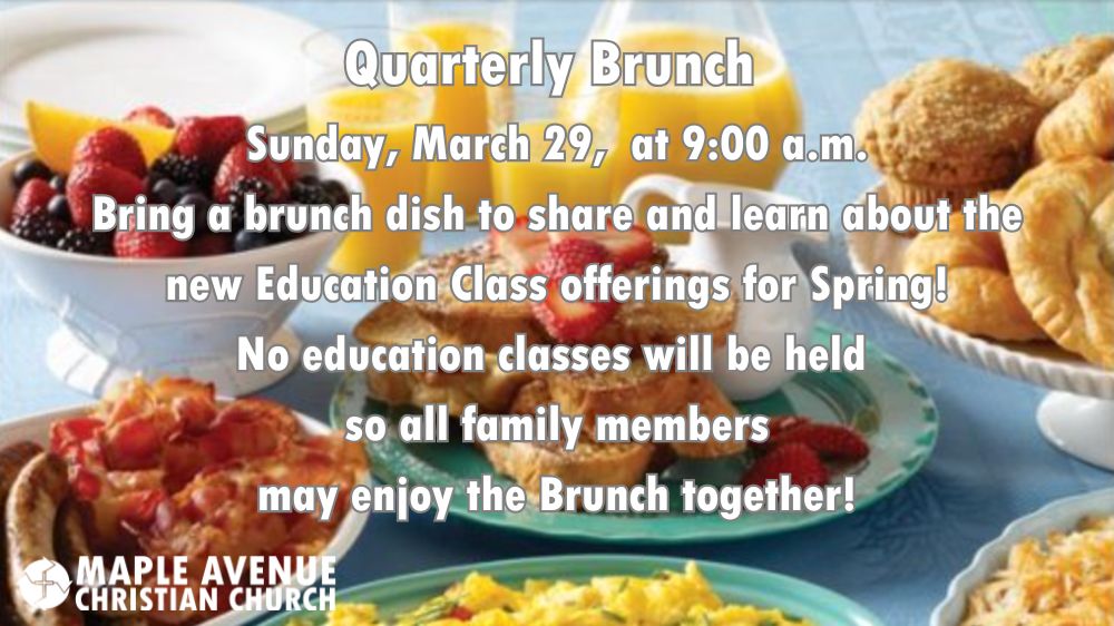 Quarterly Brunch, Sunday, March 29, Starting at 9:00 a.m.